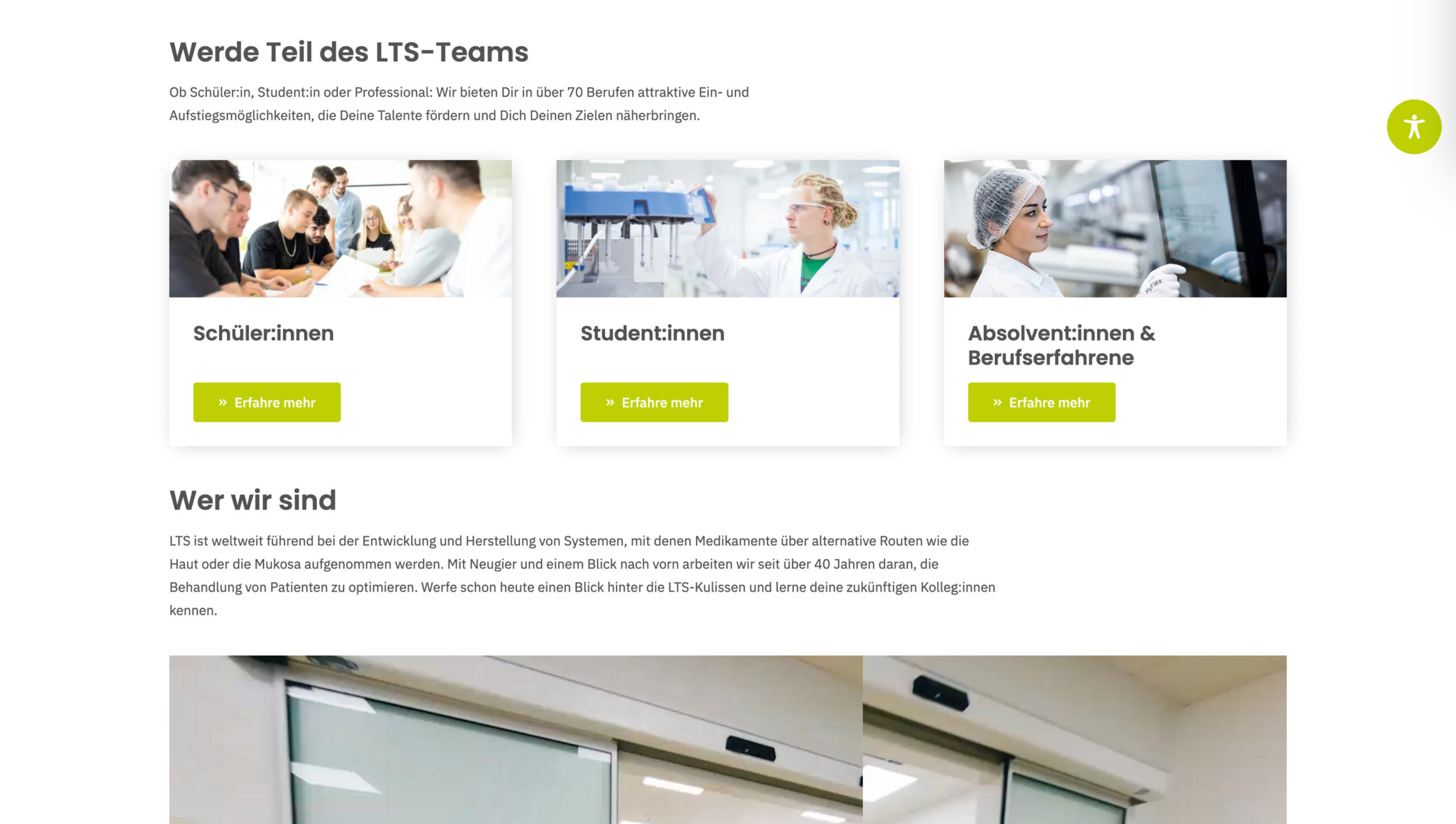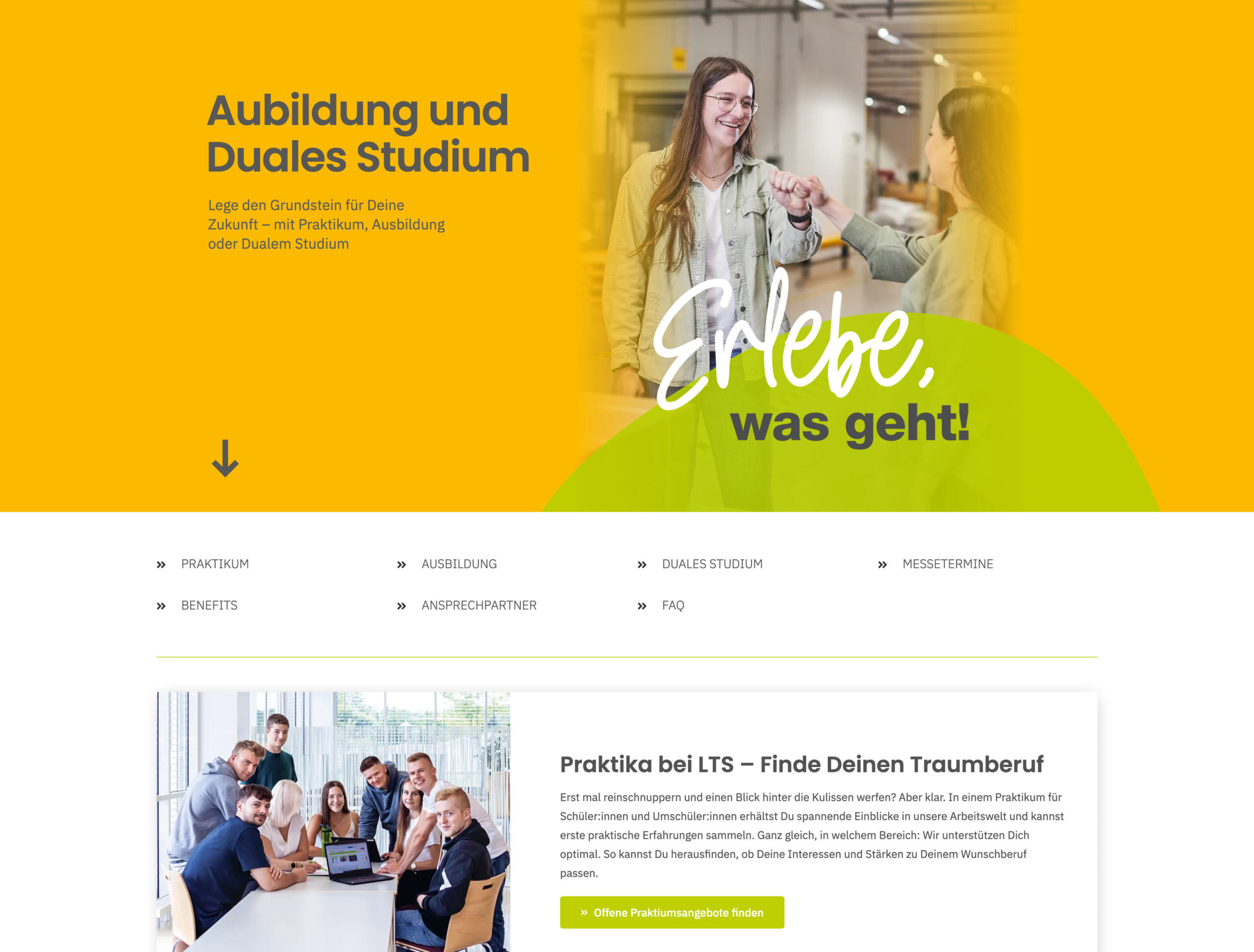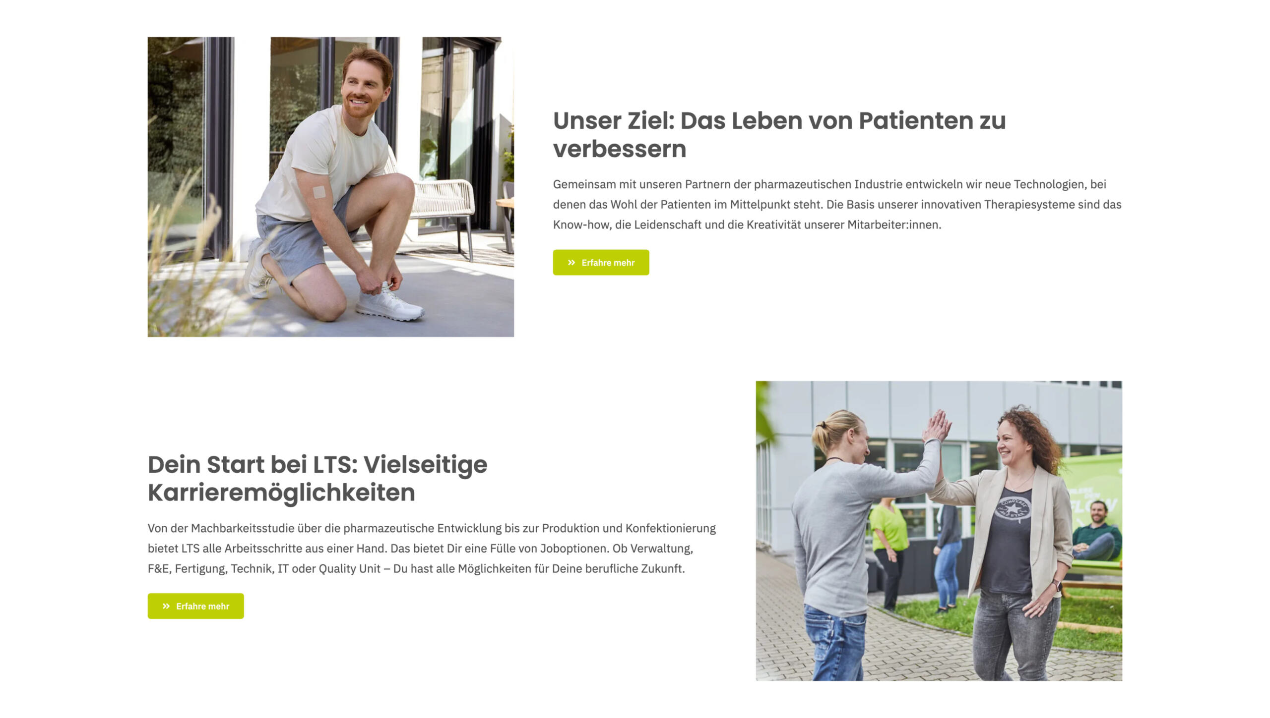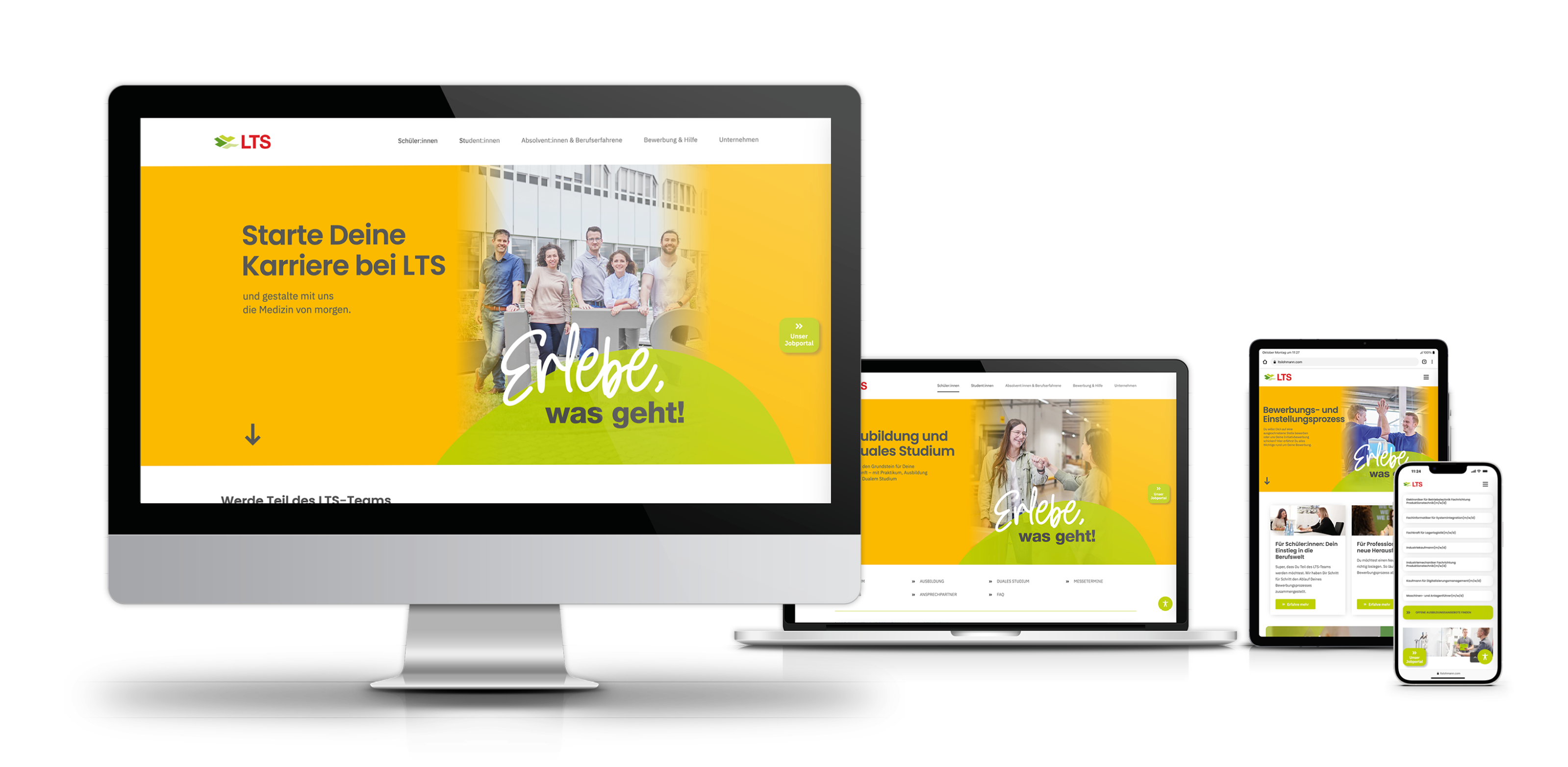 Für die LTS AG, ein führendes pharmazeutisches Technologieunternehmen, haben wir die Candidate Journey neu strukturiert – und das Kampagnenmotto „Erlebe, was geht!“ in die digitale Welt übertragen. Die neue Karriereseite bietet klare Einstiege für Schüler:innen, Student:innen und Berufserfahrene, zeigt echte Mitarbeitende im Alltag und führt direkt ins SAP SuccessFactors-Jobportal.