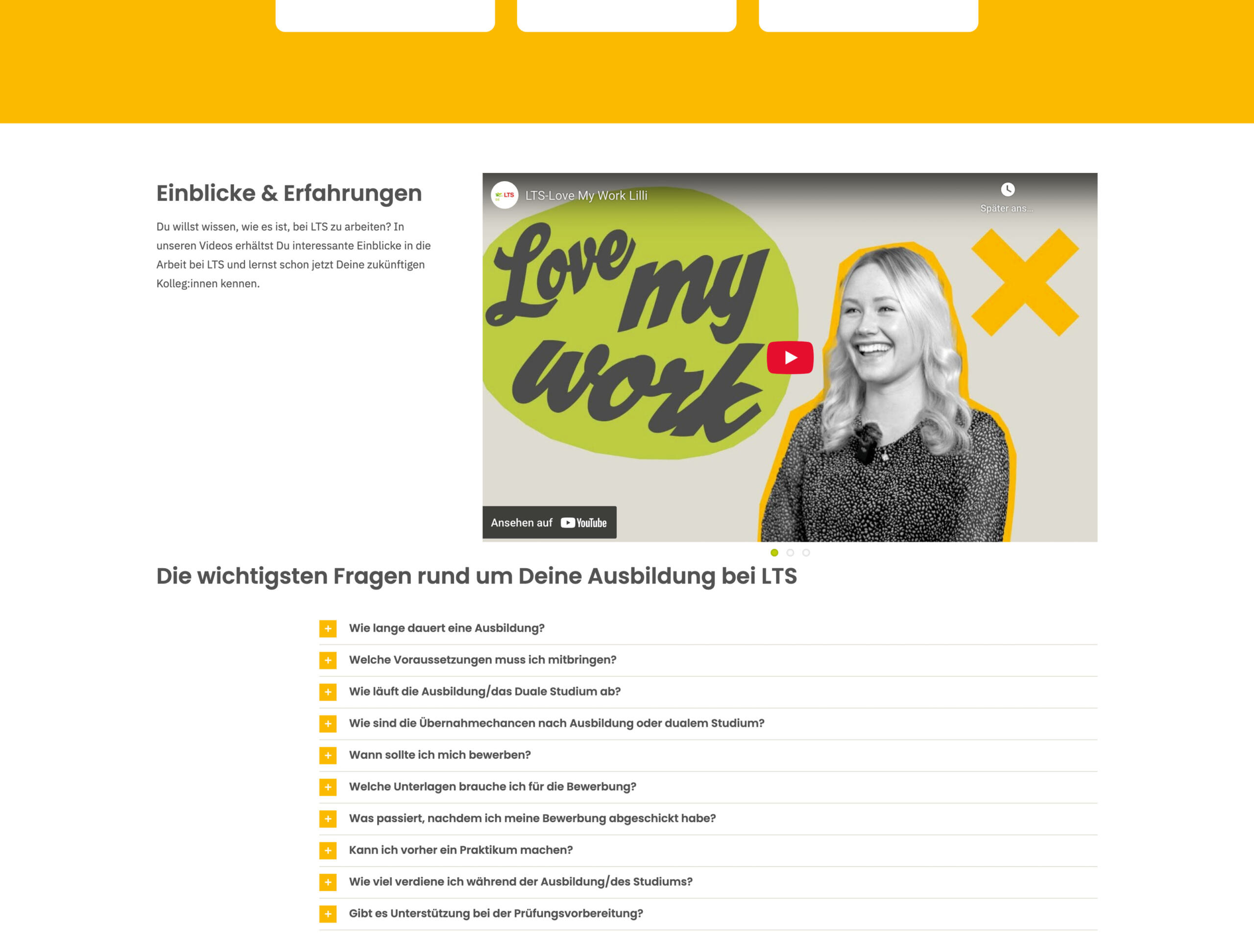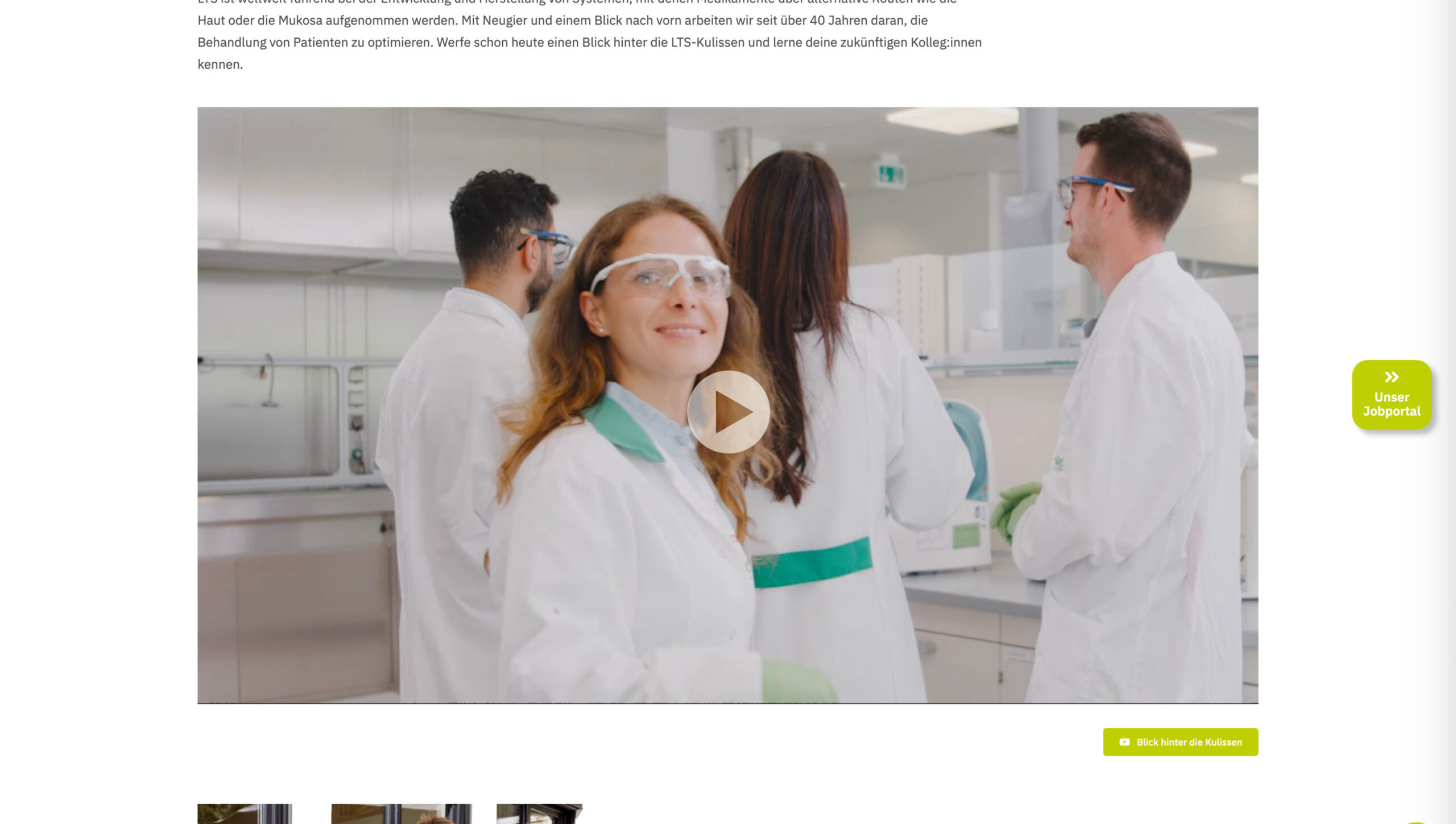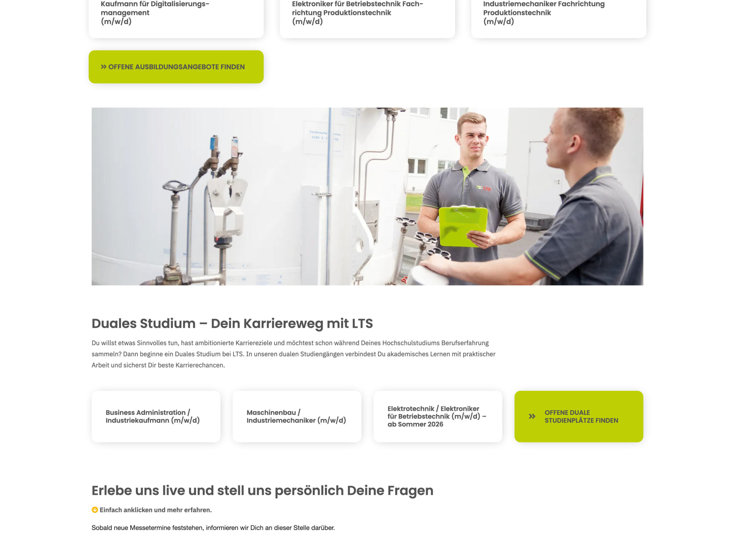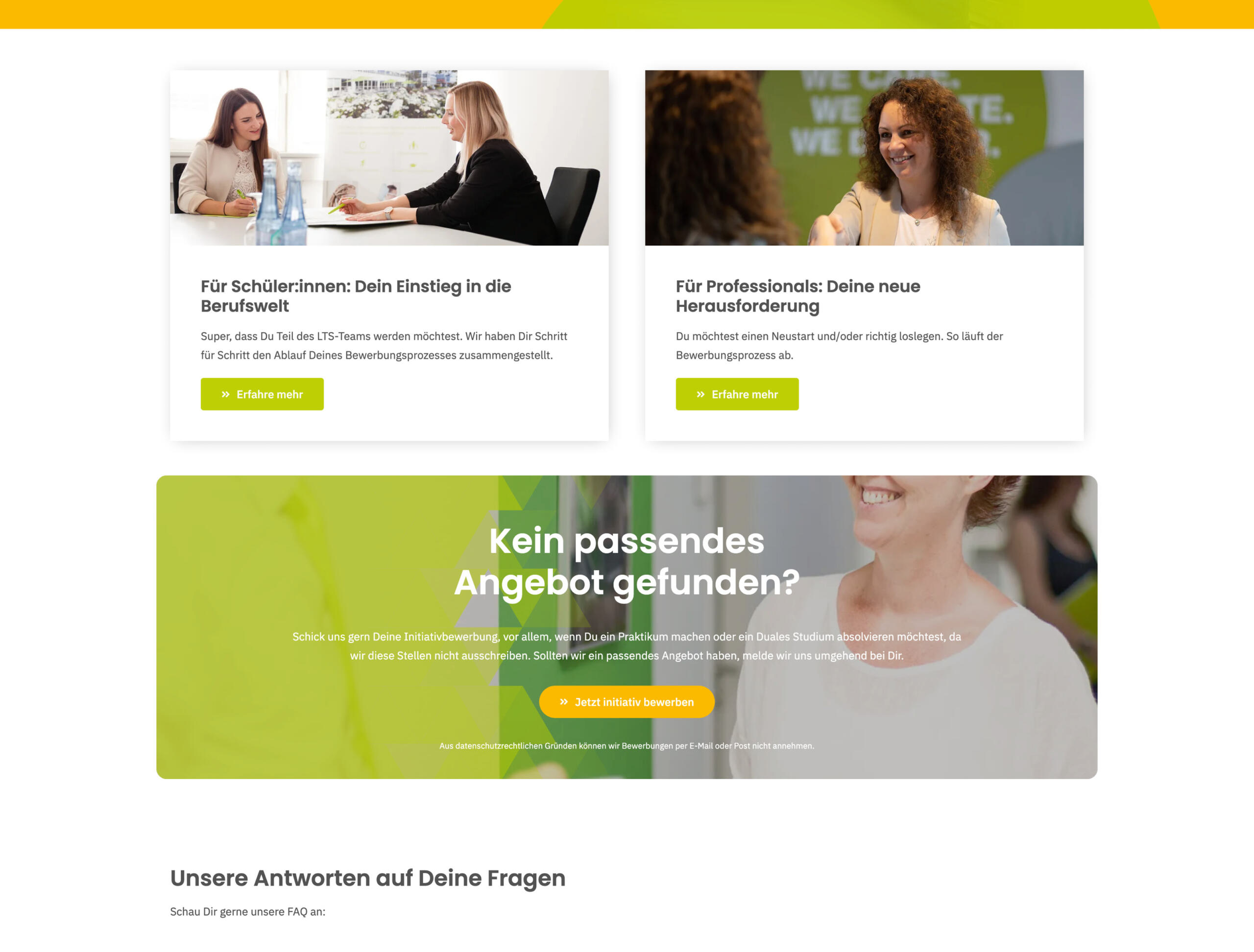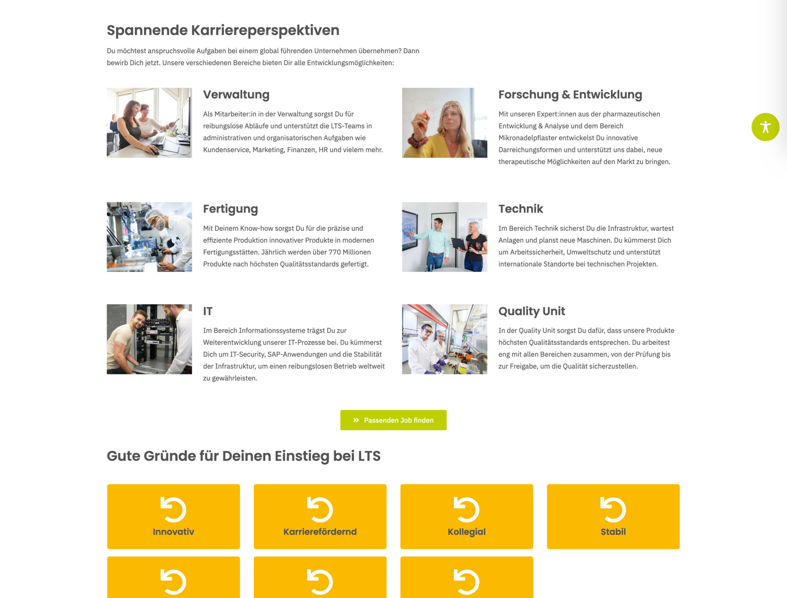 Für die LTS AG, ein führendes pharmazeutisches Technologieunternehmen, haben wir die Candidate Journey neu strukturiert – und das Kampagnenmotto „Erlebe, was geht!“ in die digitale Welt übertragen. Die neue Karriereseite bietet klare Einstiege für Schüler:innen, Student:innen und Berufserfahrene, zeigt echte Mitarbeitende im Alltag und führt direkt ins SAP SuccessFactors-Jobportal.