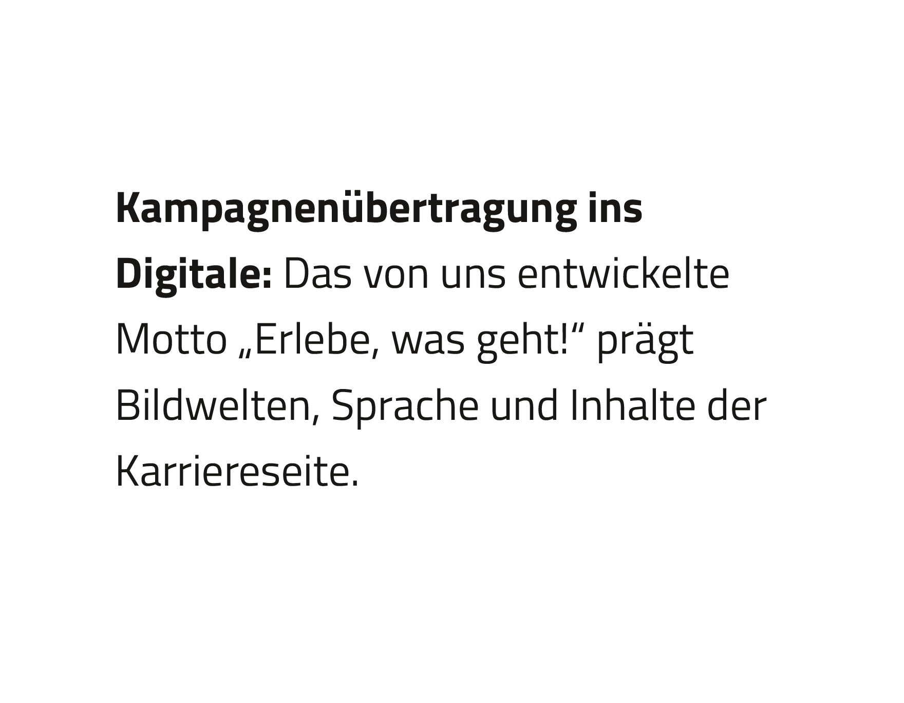 Die neue Karriereseite übersetzt das Kampagnenmotto „Erlebe, was geht!“ konsequent ins Digitale, sorgt für Orientierung, stärkt das Employer Branding und bietet Bewerber:innen einen klaren Weg von der ersten Information bis zur Bewerbung.